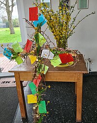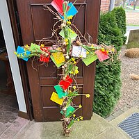 An Ostern ist plötzlich alles verwandelt. Das Leben wird wieder neu. Die Hoffnung wächst. Es ist doch noch nicht alles zu Ende. Jesus lebt. Als Zeichen für das Wunder von Ostern haben die Presbyterinnen und Presbyter in Neuenknick das Kreuz an Ostersonntag bei der Offenen Kirche geschmückt, durch die vielen bunten Zettel und die Blumen ist es jetzt ein ganz buntes Kreuz. Dieses schöne Zeichen knüpft an die Idee an, dass das Kreuz Christi zu einem neuen Lebensbaum wird. Das mit Blumen geschmückte Kreuz ist so ein Hinweis darauf, dass sich das, was uns drückt und lähmt, verwandeln kann in Blüten der Lebensfreude und des neuen Mutes.